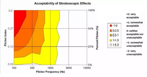 2015年發布的IEEE 文件中,將頻閃風險分為幾個等級,如下圖所示,綠色面積覆蓋的是無風險的等級,而黃色區域則是低風險類,超過黃色部分是不能被接受的。