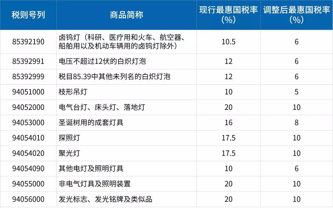 本次進口關稅調整包括11類照明電器產品,平均下降幅度在50%左右。具體如下表所示: